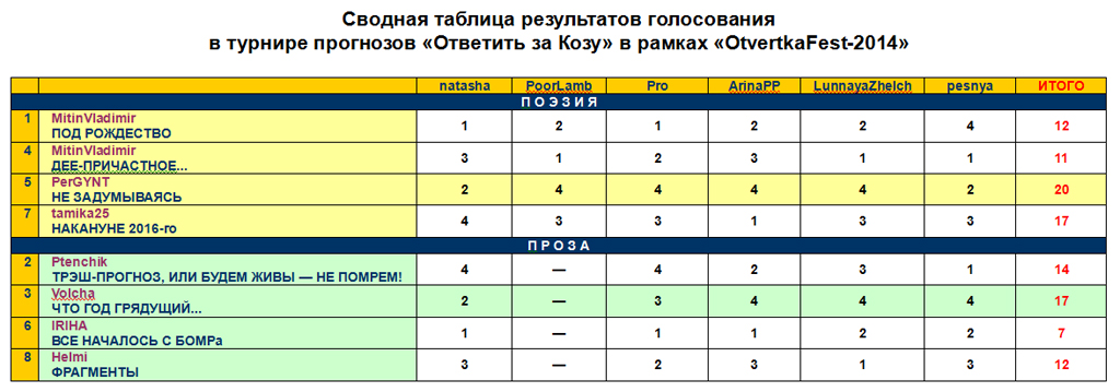 | Сводная таблица новогоднего турнира прогнозов «Ответить за Козу» в рамках «OtvertkaFest-2014» |