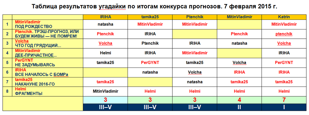 | Сводные итоги результатов угадайки «Дело о тайных пророках - 2014» по турниру прогнозов в рамках «OtvertkaFest - 2014» |
